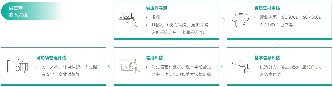 公司与所有正式供应商签署《供应商行为准则》和《供应商诚信廉洁承诺书》,遵循公开、公平、公正的采购原则,明确双方在合作开展中应持有的诚信与透明度,确保所有合作伙伴都认同并遵守共同原则。同时公司将社会和环境方面的合规要求纳入供应商合同,从法律层面推动供应商履责。