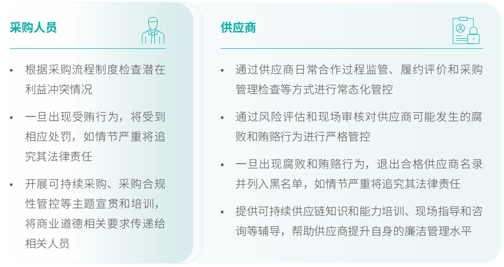 我们坚持“阳光采购”,要求所有供应商签署《供应商行为准则》和《供应商诚信廉洁承诺书》,并在采购合同中加入供应商廉洁相关条款。同时在供应商准入、聘用、审核等多个流程中均对腐败、贿赂、利益冲突等违规行为提出规范要求。公司通过商业道德和供应商管理双重管控,对采购人员和供应商双向监管,确保企业与供应商之间不发生违反商业道德的往来。