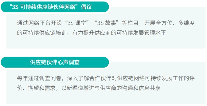 我们积极探索减碳方案,按照“减量化、再利用、再循环”的原则编制形成《可循环包装方案》及登记表等配套工具,推进供应链环节可循环包装方案落地应用,探索价值链减废、减碳,带动上下游企业及行业共同进步。