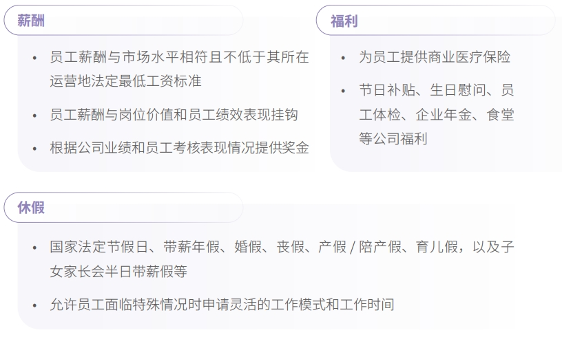 公司不断完善员工薪酬福利体系,以具有市场竞争力的薪酬水平吸引人才、激励人才,并定期开展组织效能分析、薪酬市场对标工作,进一步优化薪酬政策或方案;为员工及其家人提供适当的生活水平保障,并通过组织文体活动、帮扶困难员工、心理健康辅导等切实提高员工职场幸福感。