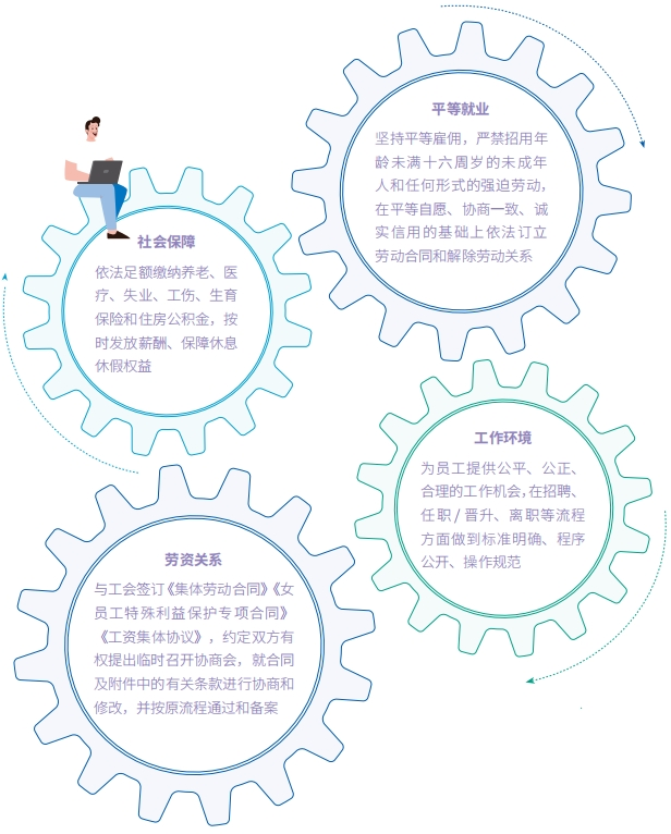 中化国际秉承以人为本的理念,严格遵守中国及各海外运营地区的法律法规,坚持“公平、公正、透明”的依法合规用工原则,建立完善的人力资源管理体系,规范招聘雇佣、薪酬福利、劳工关系、社会保险等管理,维护员工的合法权益。
