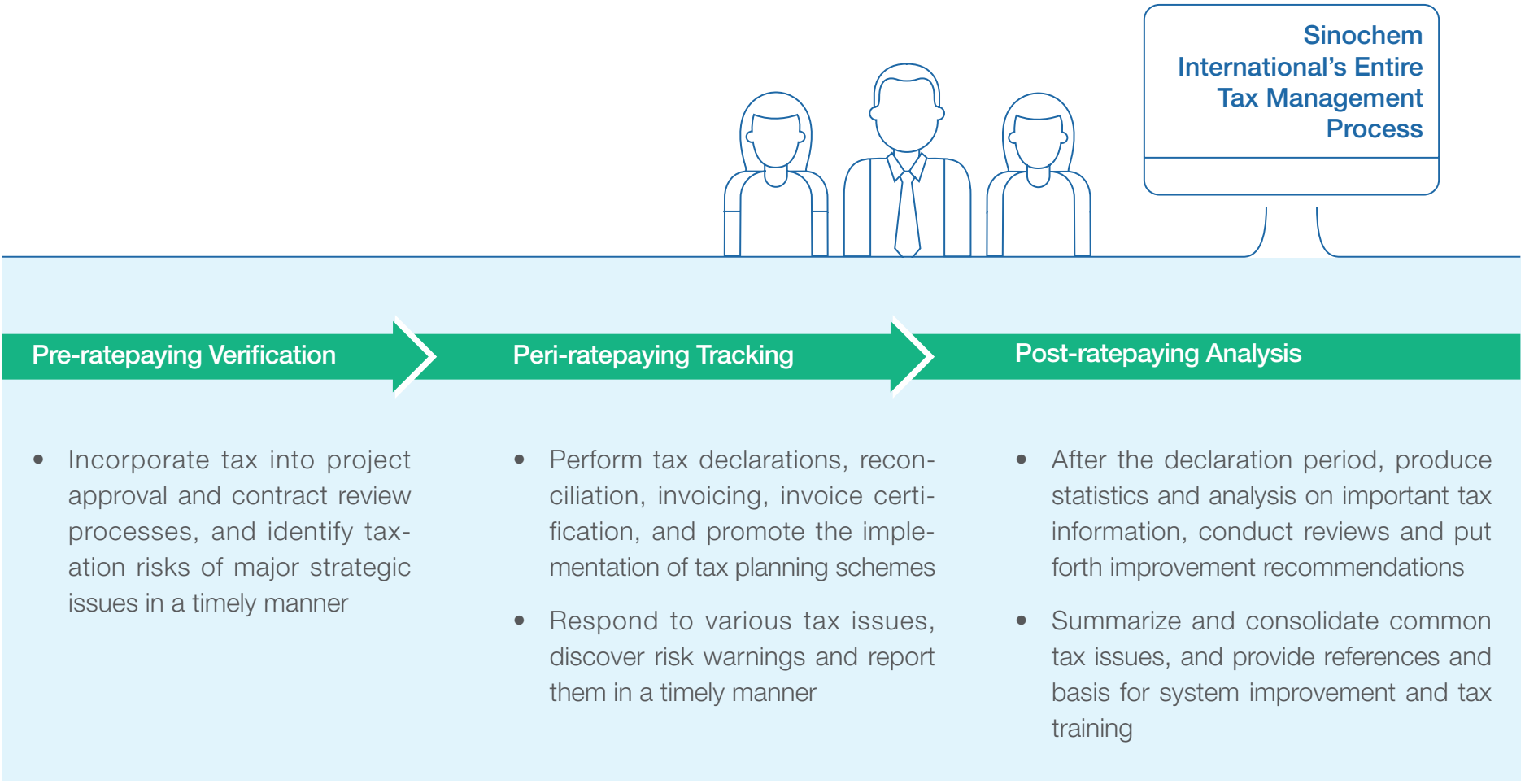 The company has established a working mechanism that closely connects tax consulting with tax operations, integrating tax-related tasks throughout the entire process of business operations. We routinized the use of tax management information systems to realize the automatic collection of tax-related data, automatic rule verification of declaration data, statistics of multi-dimensional data indicators and tax risk management. Tax informatization is employed to improve efficiency and the quality of declaration data while reducing tax risks.